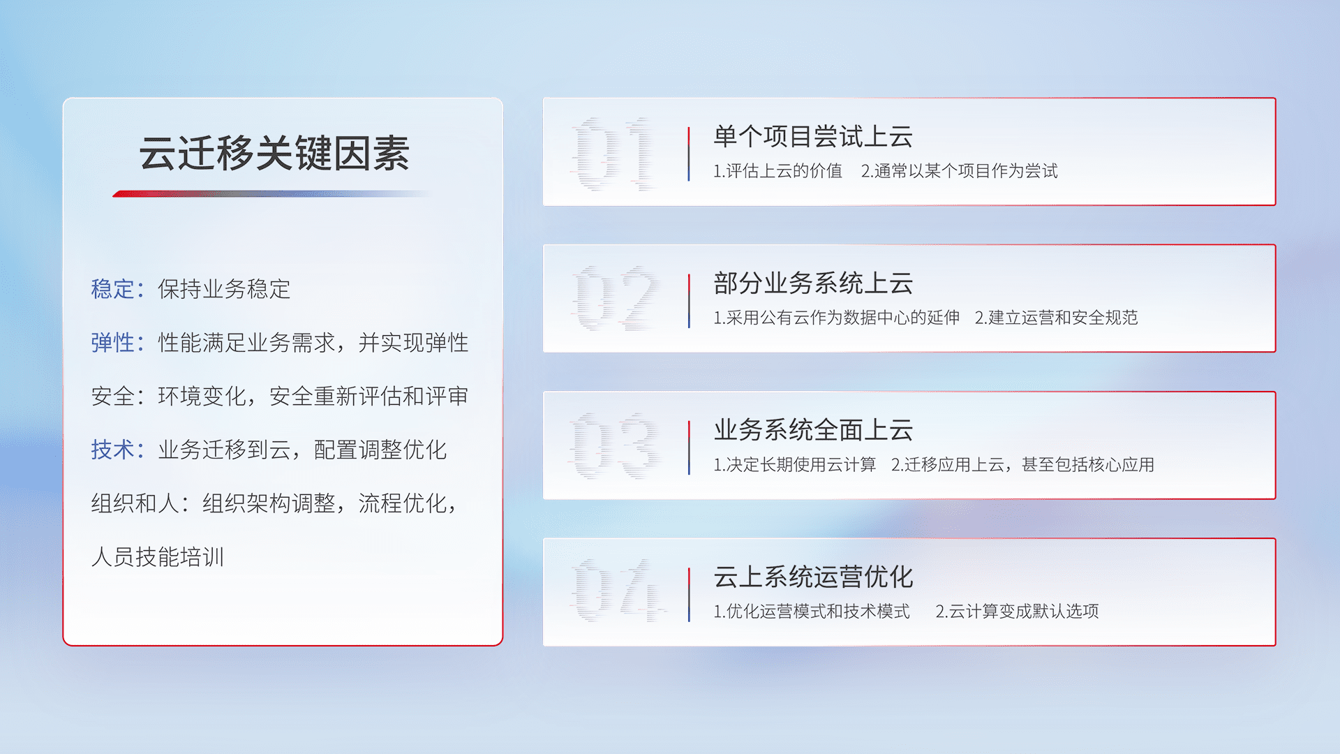 结合实际业务,,,,从规划设计、、云平台选型、、、、云原生改造、、、、数据迁移、、集成交付,,,,迁移全过程为客户识别最佳上云路径,,,做好风险识别管理,,设计网络架构、、、身份权限、、、、安全审计合规、、操作审计、、、日志审计、、监控告警策略、、、、多站点容灾设计等,,,对云上基础设施进行整体规划,,,提升IT治理水平,,,,以满足弹性、、、高可用、、、高性能的需求。。。。